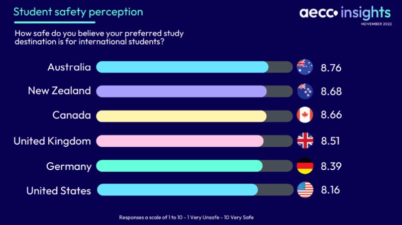 AECC(AECC Insights Student Survey)近日發(fā)布的《全球留學趨勢報告》中顯示,澳大利亞以8.76分(滿分10分)的高分位居榜首,被認為是最安全的留學目的地;